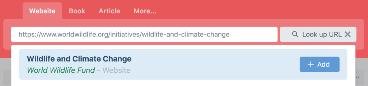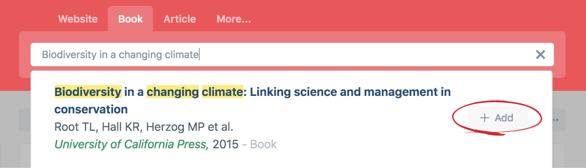 - A list of suggestions will appear, choose the book your want to cite and click Add