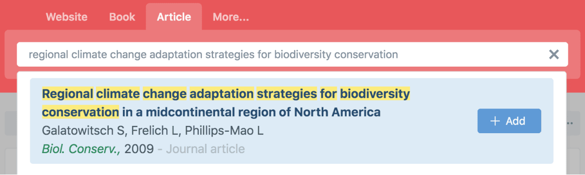 - A list of suggestions will appear, choose the article you want to cite and click Add