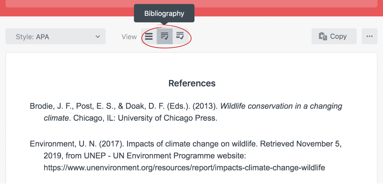 To preview your bibliography, change the view from Plain list to Bibliography or Bibliography and in-text citations.