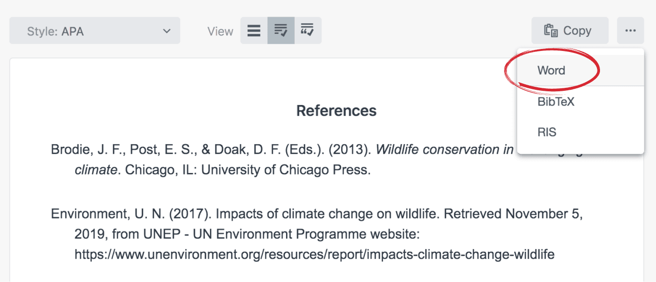 Help CiteHow to create a Word file with a bibliographyClick the More actions icon right above your main listSelect WordA Word file with your bibliography will automatically download to your computer