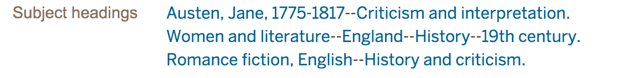 The Library of Congress assigns subject headings to books based on their topics. Books can have more than one subject heading assigned to them. For instance, The Cambridge Companion to Jane Austen, an edited volume with essays about Jane Austen’s life and works, has multiple subject headings: